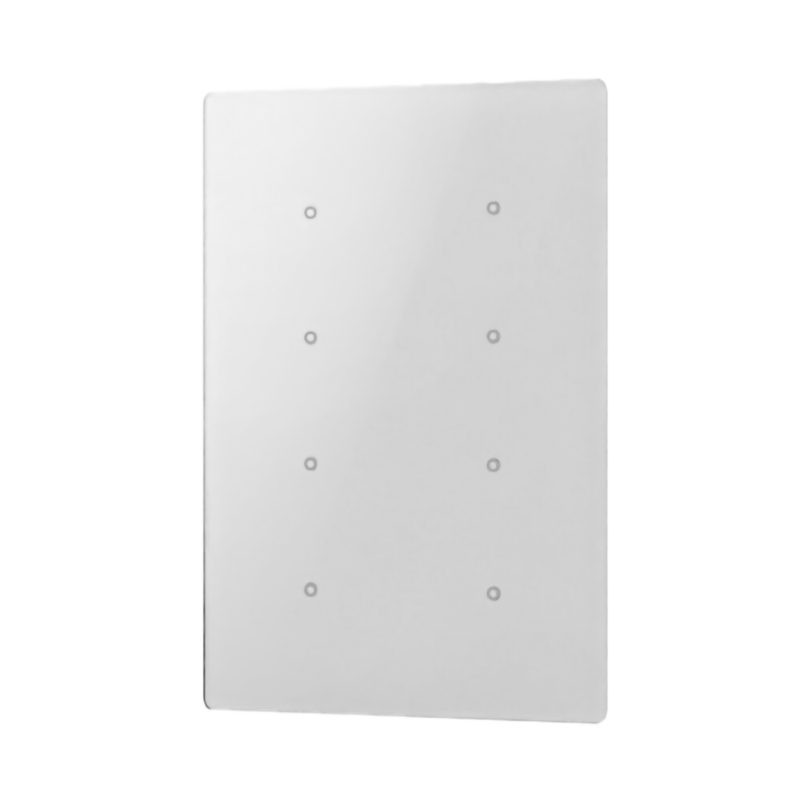 Vertical format, white basic BUSing capacitive push button with 8 independent, fully programmable touch areas. LED indicator associated with each of the touch areas. Built-in temperature sensor with concealed PI thermostat for greater comfort and energy savings. On/off, PWM or continuous temperature controller to control the main and additional heating/cooling systems.