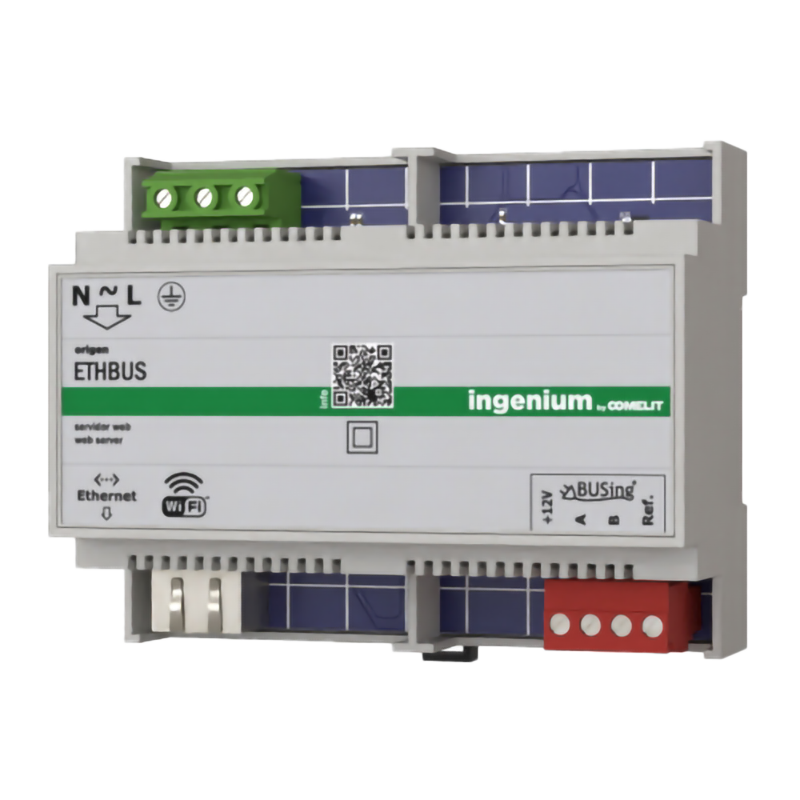 Web server for remote control of the BUSing® installation from the free Ingenium apps for iOS or Android and from a web browser. This web server includes Wi-Fi connectivity and an RJ45 Ethernet port. It is possible to view BUSing® projects by plans (configured in the SIDEKNX tool) or by rooms (images, labels, icons, etc., fully configurable by the user from the iOS/Android app). Support for annual timings, IFTTT, technical alarms and push notifications. Compatible with Google Home and Alexa. It can be configured as a Modbus server.