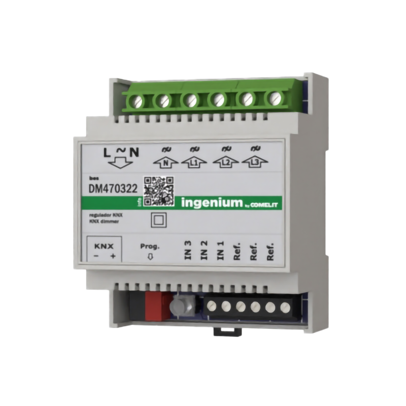 Universal 3-channel KNX dimmer with maximum load of 200 W per channel. This device allows the regulation of any type of load, whether halogen, incandescent or LED. It is designed to avoid flickering, incompatibility or other inconsistencies resulting from lighting adjustment. It has 3 low-voltage inputs (SELV) for conventional push buttons (non-programmable and connected to the corresponding outputs). Thermal protection and short-circuit protection. Microcontroller-based digital control with more than 200 regulation points.