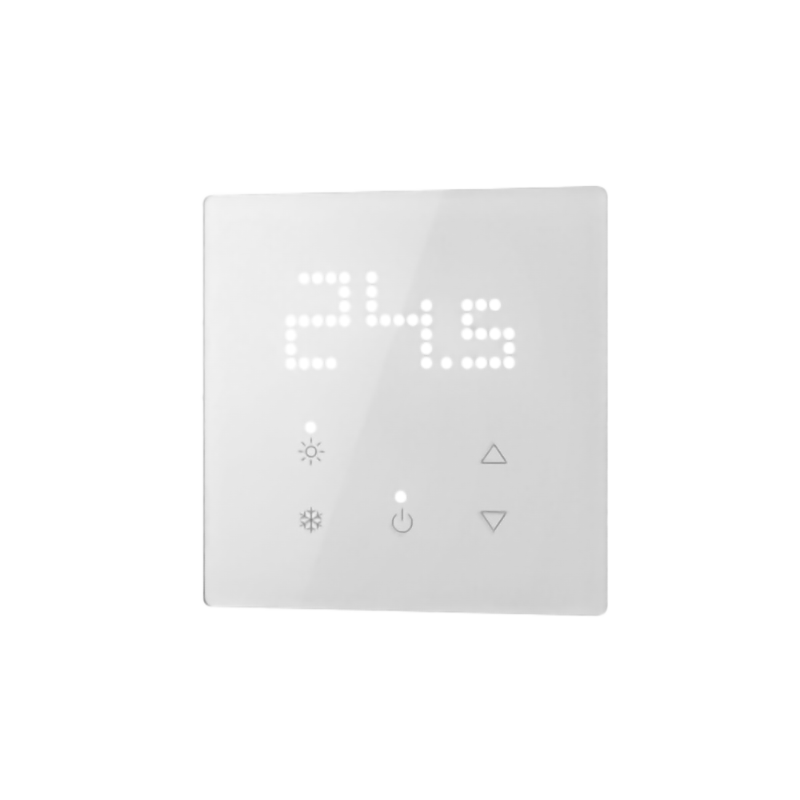 Λευκός θερμοστάτης τεχνολογίας BUSing με ενδείξεις LED για τον έλεγχο ανεξάρτητης ζώνης κλιματισμού ο οποίος διαθέτει 5 περιοχές ελέγχου αφής και ενσωματωμένο κρυφό ελεγκτή PI για μέγιστη άνεση και εξοικονόμηση ενέργειας ενώ περιλαμβάνει αισθητήρα υγρασίας επιτρέποντας τον υπολογισμό του σημείου δρόσου βάσει της σχετικής υγρασίας και της μετρούμενης θερμοκρασίας.